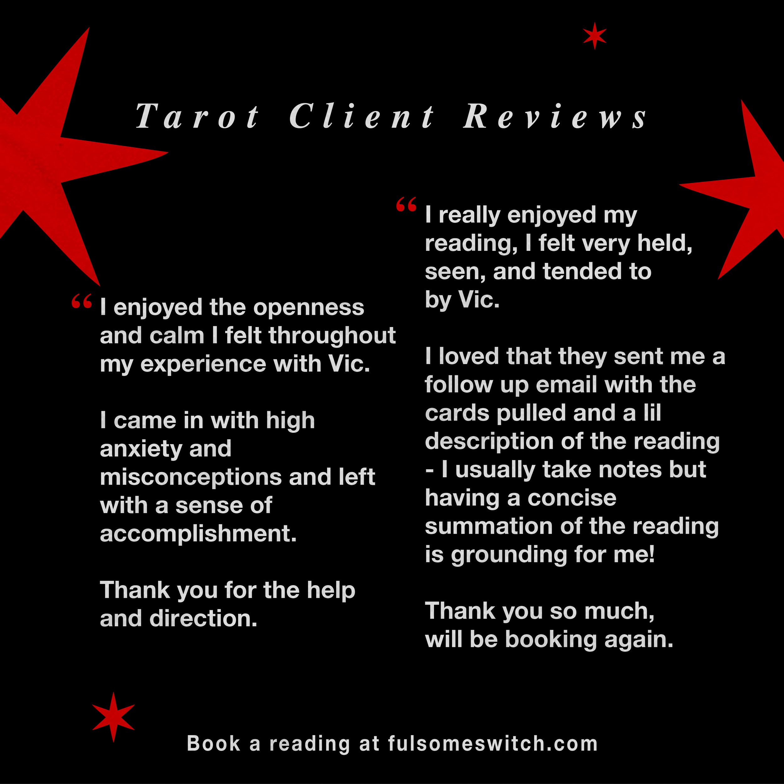 “ I really enjoyed my reading. I felt very held, seen, and tended to by Vic. I loved that they sent me a follow-up email with the cards pulled and a lil description of the reading - I usually take notes, but having a concise summation of the reading is grounding for me! Thank you so much, will be booking again.”